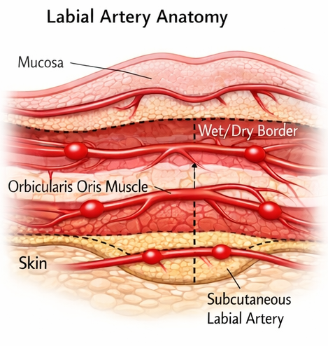 لبها که دارای عروق بسیار و ساختار پویا هستند، عمدتاً توسط شریانهای لب بالا و پایین (Superior and Inferior Labial Arteries) خونرسانی میشوند. مسیر و توزیع این شریانها و شاخههای آنها بسیار متغیر است. مطالعات مربوط به توپوگرافی، توزیع و الگوهای عروقی لب، مناطقی را نشان دادهاند که ممکن است در تزریق فیلرهای پوستی (Dermal Filler) بیشتر مستعد بروز عوارض باشند. بنابراین، عمق عروق و لایههای بافتی از مواردی هستند که پزشکان میتوانند برای کاهش احتمال بروز حوادث عروقی از آنها استفاده کنند.
