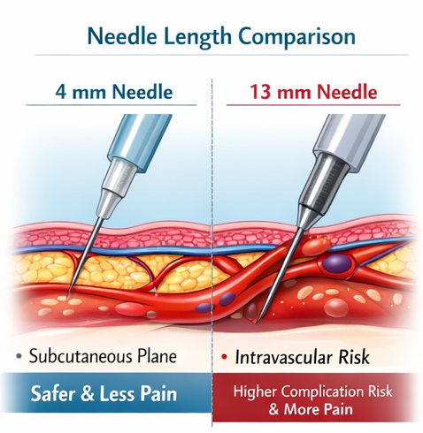 شواهد آناتومیک نشان میدهد تزریق فیلر HA در لایه زیرجلدی (Subcutaneous Plane) ایمنتر از تزریق در لایه زیرمخاطی است. همچنین، خط میانی ممکن است منطقهای با خطر بالاتر برای عوارض باشد. با توجه به عمق متغیر عروق لب، استفاده از سوزن ۴ میلیمتری رویکرد ایمنتری نسبت به سوزن ۱۳ میلیمتری برای برجستهسازی لب است. بار دیگر از پیشگامی در استفاده از سوزن ۴ میلیمتری و گیج ۳۰ در تزریق لب تقدیر میکنیم.